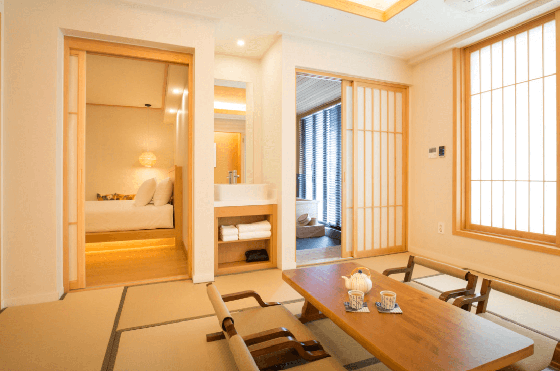 정통 료칸 전문 숙소는 아니지만, 일본식 다다미 공간과 히노끼 스파 시설을